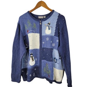 Croft Barrow Cardigan sweater Plus 2X Zip Up Snowman Blue Ski Forest Embroidered