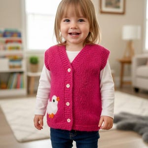 Hand-Knitted Bright Pink Baby,Toddler Vest with Cute Duck Applique